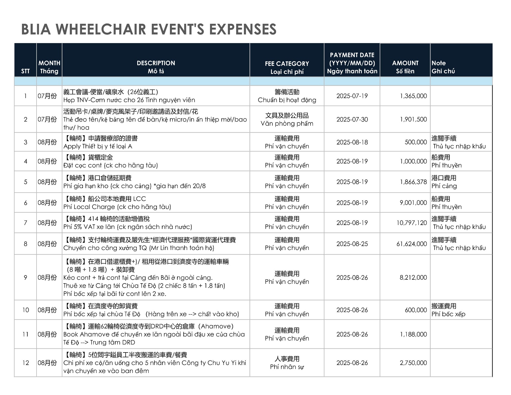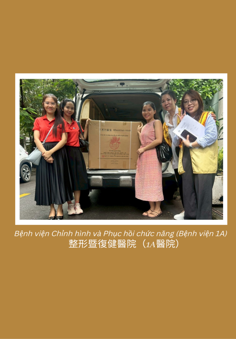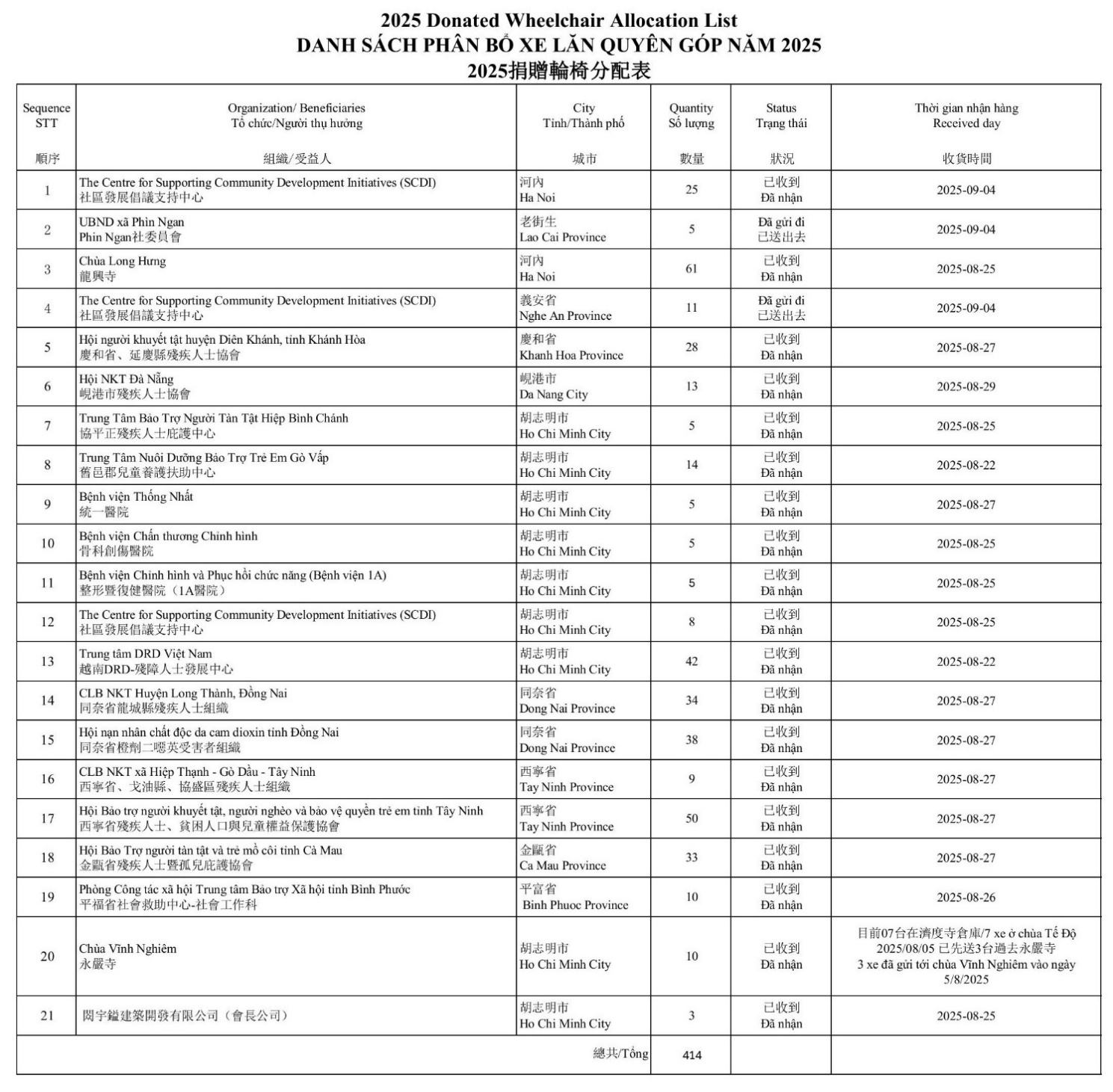 在本次活動中,國際佛光會(BLIA) 和台灣財團法人曹仲植基金會(CZZF) 總計捐贈 414 台輪椅總共價值1,656,000台幣約14億多越南盾(不含稅、海運以及陸地運費的費用),分送至越南北部、中部及南部的20個單位,包括殘疾人中心、社會組織、醫院及寺廟。