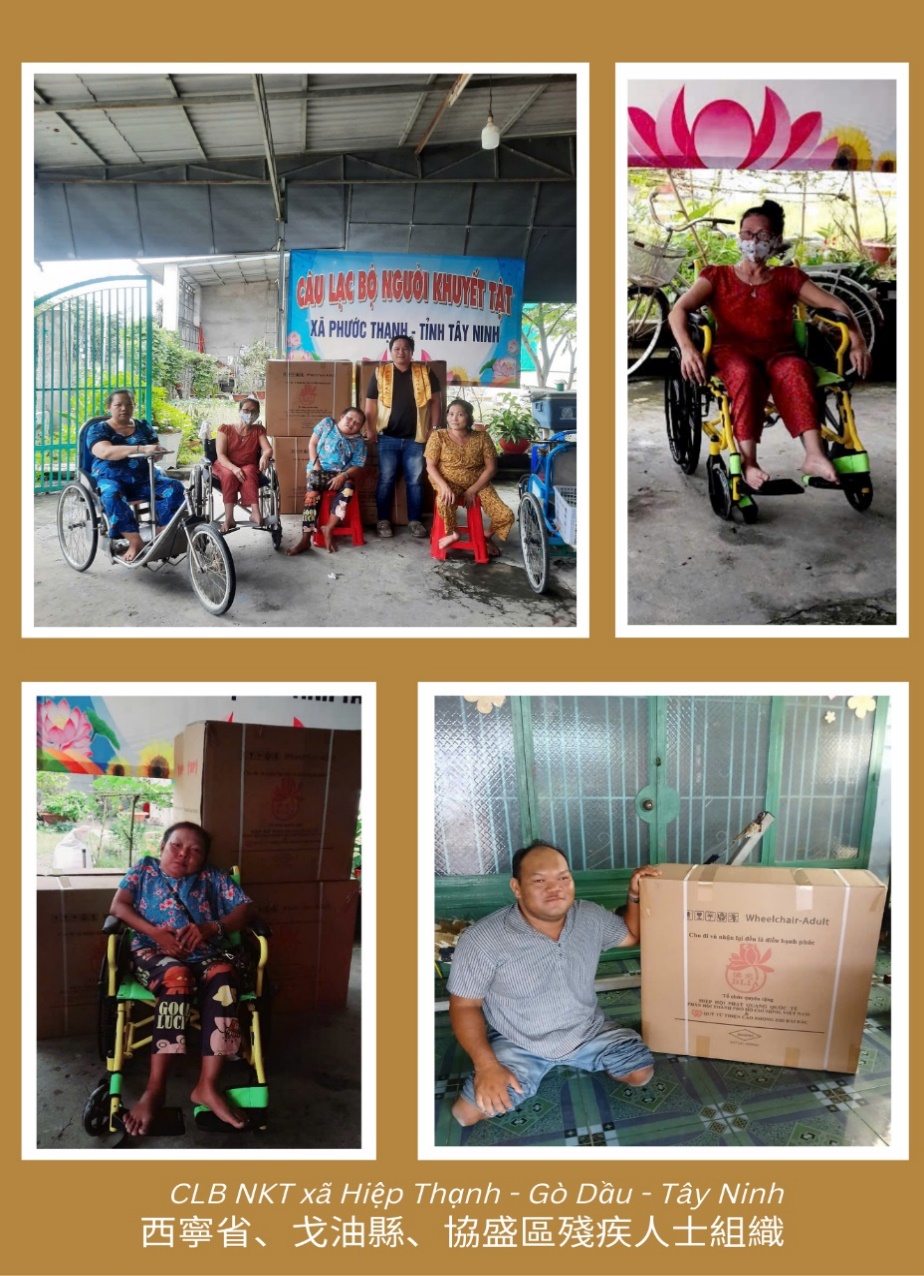 Hoạt động lần này có thể hoàn thành viên mãn là nhờ sự hỗ trợ và chung tay của đông đảo quý vị. Đặc biệt, xin bày tỏ lòng tri ân sâu sắc đến: Hiệp hội Phật Quang Quốc tế (BLIA), Quỹ Từ thiện Cao Zhong Zhi – Đài Loan (CZZF), Thượng tọa Thích Thanh Phong – chùa Vĩnh Nghiêm, ông Lin Ching Shun – Công ty TNHH Kiến trúc Chu Yu Yi, ông Wu Kuo Pen – Công ty TNHH Thương mại & Đầu tư Hùng Đức. Trong quá trình vận chuyển xe lăn đã dành sự hỗ trợ và giúp đỡ vô cùng quý báu, giúp cho lô xe lăn này có thể đến nơi an toàn và kịp thời trao tặng đến những người cần đến.