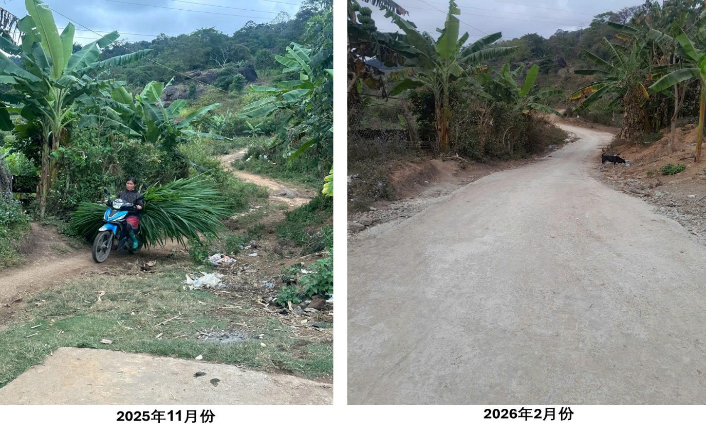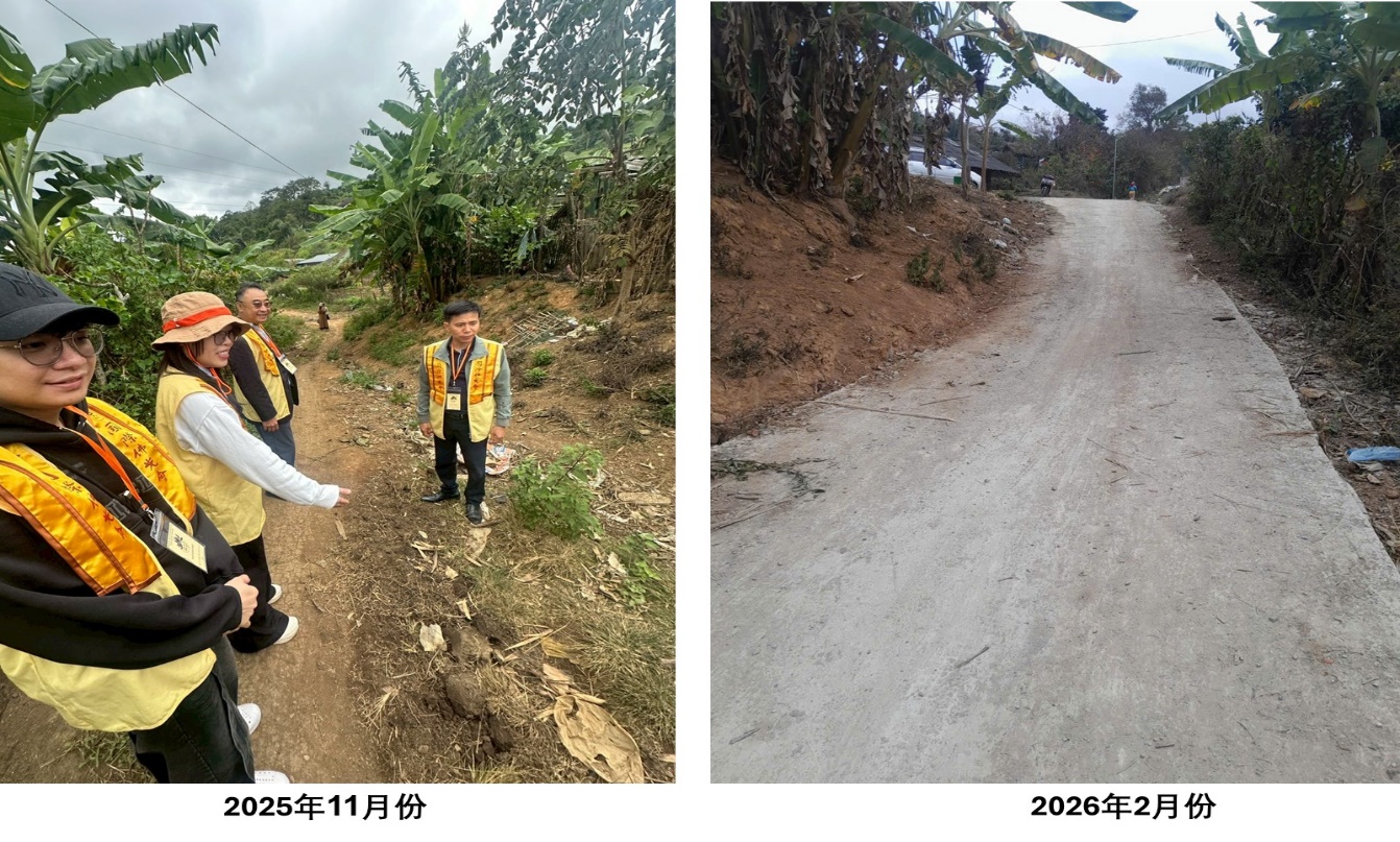 此外,該村莊有一段約50公尺 的道路,為社群運輸糧食與物資之重要通道,惟目前路面嚴重損壞、水土流失、坑洞眾多,嚴重影響通行安全。鑑於村民已完成秋收,基本糧食無虞,工作小組決議將原規劃購買白米之經費,改用於採購建築材料,以修復並改善該關鍵路段,提升居民交通安全與生活品質。