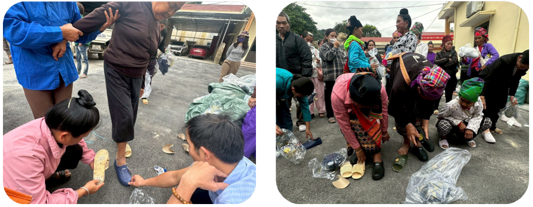 Mường Nhà鄉社距離省會中心超過 100 公里,約有 100 戶居民 屬於生活困難群體。當地居民對本次物資發放抱持高度期待,並期盼能親自試穿全新的鞋子。由於長期資源匱乏,村民所穿鞋子多為反覆修補後再使用。